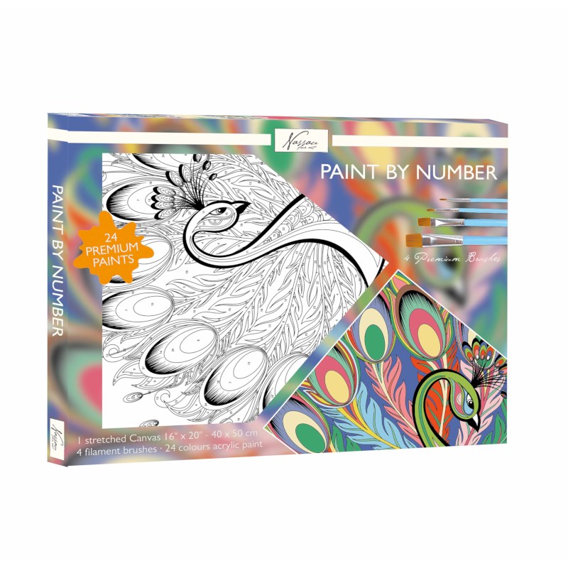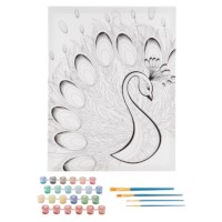 Compleet pakket om een eigen schilderij te maken. Het doek is voorbedrukt met kleurnummers zodat je eenvoudig deze pauw kunt schilderen.