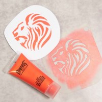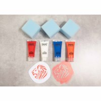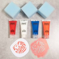 Set met 4 kleuren liquid make-up tube 8 mm, rood wit blauw en oranje. (001/301/515/773), 1 sjabloon van een leeuw en een uitwasbare spons.