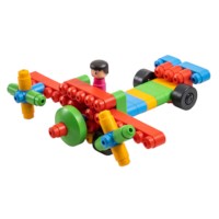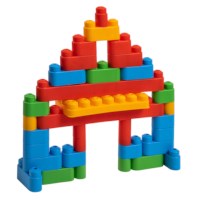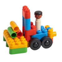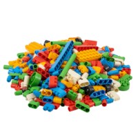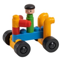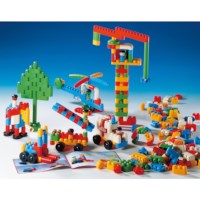 U krijgt geleverd: Een schoolset met 400 onderdelen, onder meer bestaande uit staven met 1, 2, 3, 4, 5, 7 en 11 cilindervormige nokken, wielen en assen, enkele poppetjes en een handig ideeënboek.