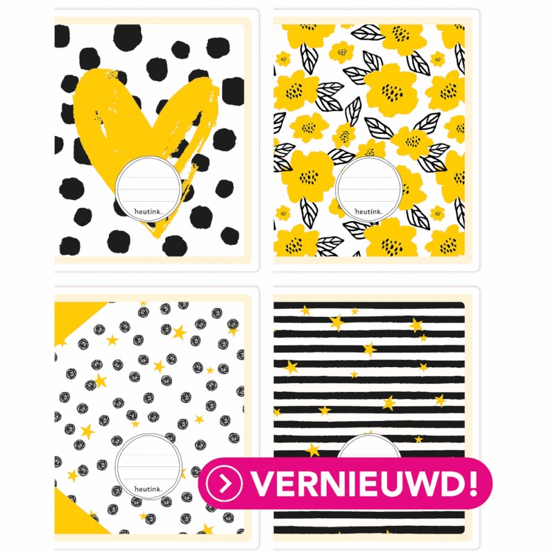 De omslagen van de cahiers zijn uitgevoerd in 4 verschillende designs en worden per stuk assorti geleverd.