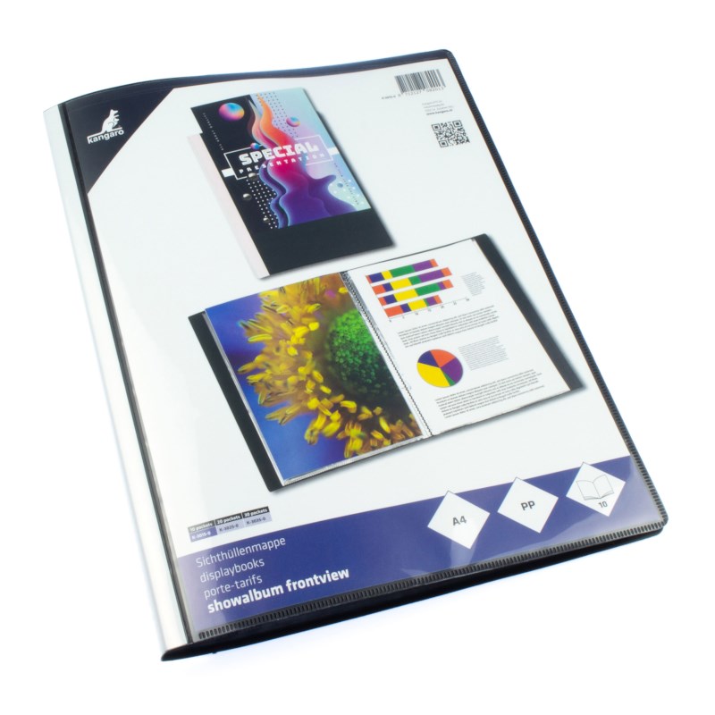 Showalbum met een stevige zwarte PP omslag, met insteektas op het voorblad. A4 formaat. 10 shotassen - 20 leesbare zijdes.