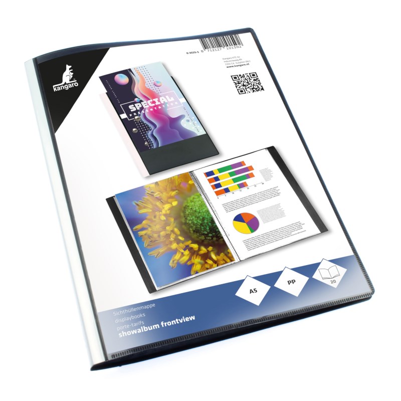 Showalbum met een stevige zwarte PP omslag, met insteektas op het voorblad. A5 formaat. 10 shotassen - 20 leesbare zijdes.