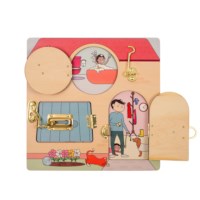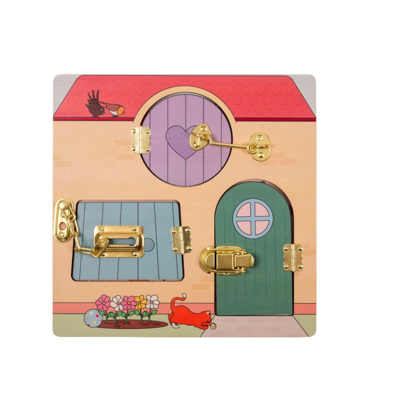 Sleuteldief - slotenbord huis daagt uit om verschillende sloten te openen en verborgen verrassingen te ontdekken. Achter elk luik schuilt iets uit het dagelijks leven, waardoor kinderen spelenderwijs oefenen met techniek en oorzaak-gevolg. Het oefenen met het openkrijgen van het bord verbetert de fijne motoriek en oog-handcoördinatie. De blinddoek en het dievenmasker maken de uitdaging nog spannender!