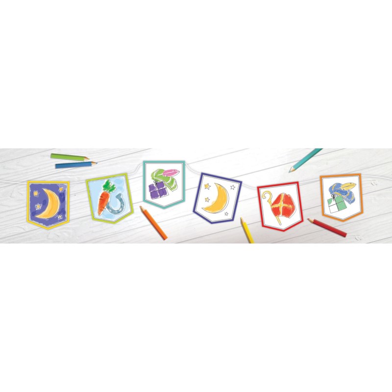 Een slinger met 6 vlaggetjes om zelf in te kleuren.