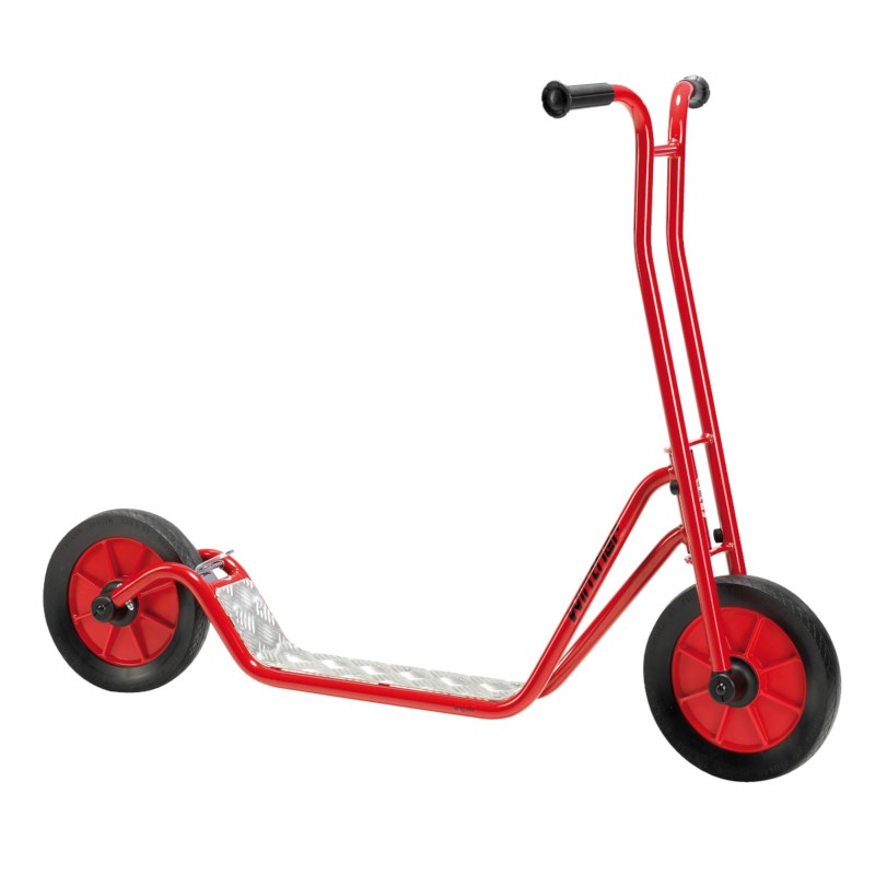 Een oersterkte step. De voetenplank is vervaardigd van gegalvaniseerd metaal met anti-slipprofiel.