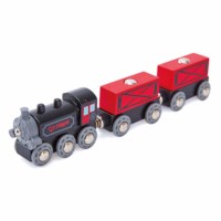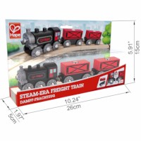 Puf je weg over het spoor met deze klassieke stoomgoederentrein! Dit mooie voertuig met een zwarte locomotief en twee felrode wagons zal de goederen op tijd leveren.
