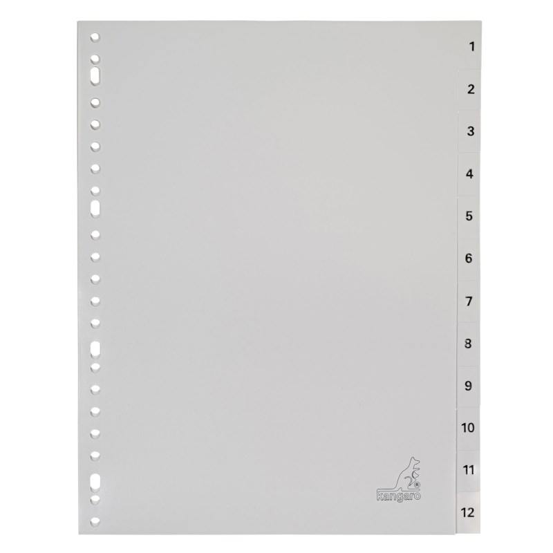 Grijze kunststof tabbladen A4 formaat - 23 gaats. Tabs zijn eenzijdig zwartbedrukt met de cijfer 1-12.