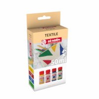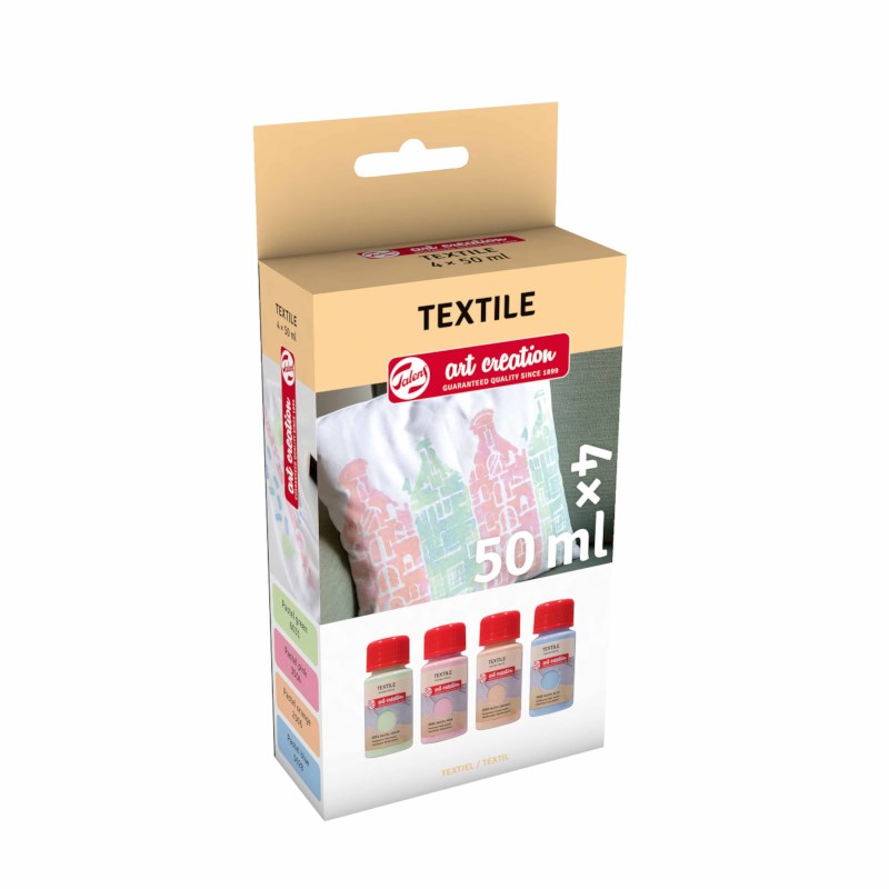 Talens Art Creation textile is een textielverf voor lichtgekleurde stoffen met minimaal 50% katoen. In deze set vind je 4 zachte pastel kleuren maar er is ook een neon set, welke wel geschikt is voor donkere kleuren en een set met een parelmoer glans. Was de stof voor het bewerken uit, zonder een wasverzachter te gebruiken. Na het opbrengen de verf minimaal 30 minuten laten drogen, alvorens het te fixeren met een strijkijzer (op katoenstand) met een vel vetvrij papier ertussen.
