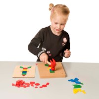 Creëer patronen met geometrische vormen in verschillende kleuren. Maak de opdrachtkaarten na of maak je eigen unieke creaties.