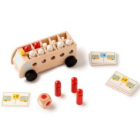 Busje komt zo! Kijk goed op de opdrachtkaart en zie hoeveel mensen er in of uit moeten stappen. Hoeveel mensen zitten er nu nog in de bus? De verschillende dobbelstenen geven nog meer uitdaging en afwisseling in het spel. Oefent de rekenvaardigheid.