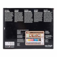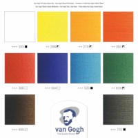 Inhoud: 10 tubes 40 ml, 2 flacons Talens hulpmiddelen 75 ml: - Schildermedium- Reukloze terpentine. 2 Van Gogh penselen- serie 294 nr. 10 (model Gussow, polyestervezel) - serie 295 nr. 6 (model rond, polyestervezel), dubbele paletdop, houten palet en reinigingsdoekje.
