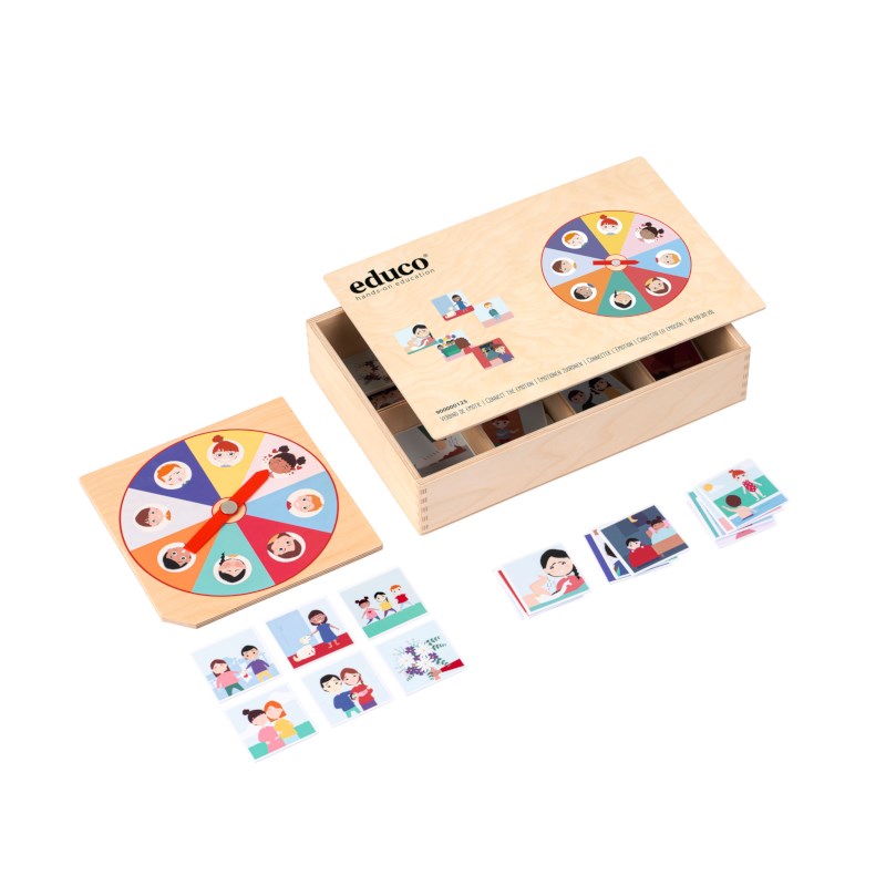 Verbind de emotie brengt gevoelens en situaties samen. Kinderen draaien de wijzer, kiezen een situatie en koppelen deze aan de juiste emotie. Door emoties te vergelijken en te benoemen, zien ze hoe gevoelens worden ervaren en gedeeld. Dit stimuleert taalgebruik en versterkt emotioneel