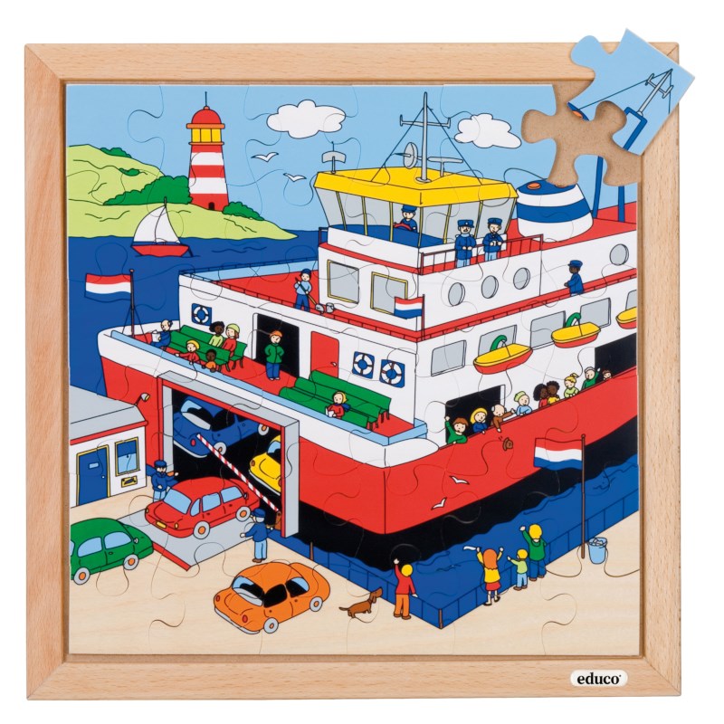 Verkeer - veerboot is een legpuzzel waarop voertuigen en passagiers aan boord gaan en de overtocht maken. Auto’s rijden de laadklep op, terwijl reizigers zich op het dek verzamelen om over het water uit te kijken. De haven en het water vormen samen een levendige omgeving waarin mensen en transport samenkomen.