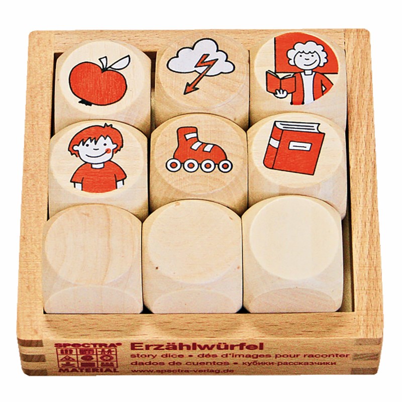 Eenvoudig werpen met de Verteldobbelstenen en dan verhalen bij de afbeeldingen vertellen. Al met twee dobbelstenen kunnen kinderen een klein verhaal vertellen. Wanneer er steeds meer dobbelstenen gebruikt worden dan worden de verhalen ook moeilijker en fantasievoller.