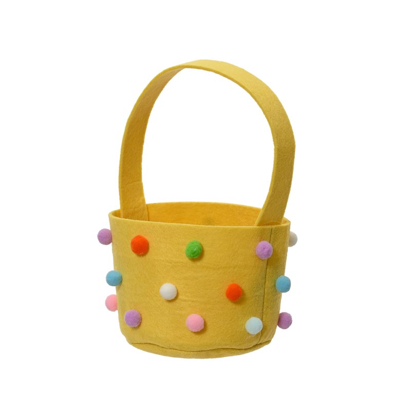 Geel vilten paasmandje versierd met gekleurde pompons.