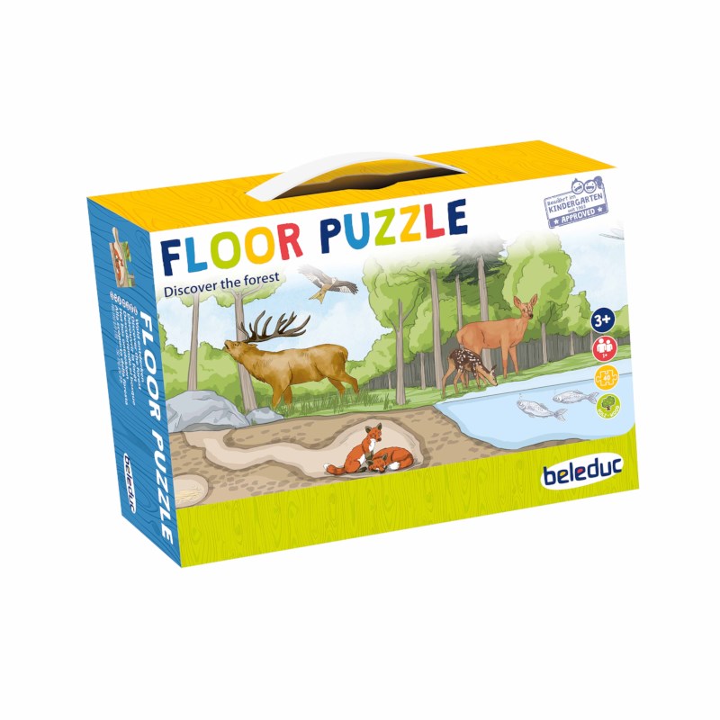 Deze vloerpuzzel ontdek het bos, bestaat uit 4 losse puzzels die aan elkaar gelegd kunnen worden. Formaat aan elkaar: 29,8 x 63 cm (l x b).