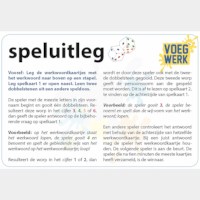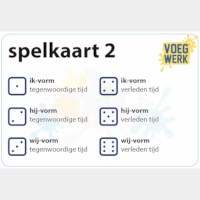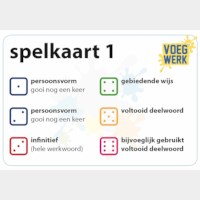 Met Voegwerk oefenen leerlingen door middel van een dobbelspel het vervoegen van werkwoorden op het gebied van de persoonsvorm, gebiedende wijs, voltooid deelwoord en bijvoeglijk gebruikt voltooid deelwoord. Tijdens het spel controleren de leerlingen elkaar met behulp van de antwoordenkaartjes. Ze kunnen er dus zelfstandig mee oefenen. Doel: Het verzamelen van zo veel mogelijk werkwoordkaartjes. Aantal spelers: 2 of meer. Start: de opdrachtenkaartjes liggen met het werkwoord naar boven. De spelkaart ligt ernaast. Wanneer er 3, 4, 5 of 6 gegooid wordt geeft de speler antwoord op de bijbehorende vraag op spelkaart 1. Wordt er 1 of 2 gegooid, dan wordt ook de tweede dobbelsteen gegooid. De tweede worp geeft de persoonsvorm aan die gespeld moet worden. Deze staat aangegeven op spelkaart 2. Een andere speler controleert het antwoord met behulp van de achterzijde van hetzelfde werkwoordkaartje. Bij een goed antwoord mag de speler het kaartje houden.