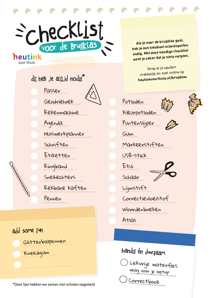 Als je naar de brugklas gaat, heb je een heleboel schoolspullen nodig. Met deze handige checklist weet je zeker dat je niets vergeet.