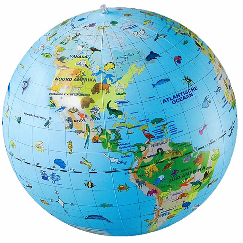 De opblaasbare globe wordt geleverd inclusief ideeën voor educatieve spellen en een lijst met dieren per regio. Het heeft een doorsnede van 50 cm en is gemaakt van een dikke PVC die prettig zacht aanvoelt en voldoet aan alle Europese standaarden. Deze bol is ook verkrijgbaar in 30 cm.