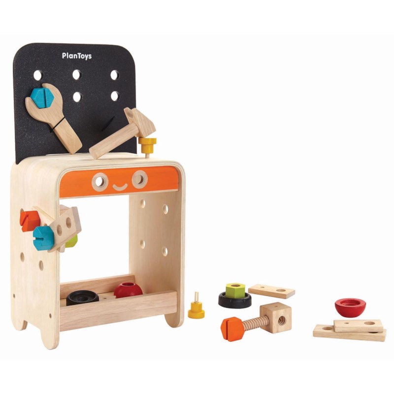 Werkbank voor de kleine klusser, uitgevoerd met mooie ronde vormen in een praktisch formaat. 22 delige set met o.a. een hamer, schroevendraaier, sleutel, bouten en moeren. Leeftijd: 3+. Formaat: 16,5 x 23,1 x 45,5 cm.