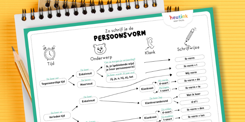 Voor het schrijven van de persoonsvorm kan jouw kind een stappenplan gebruiken. In zo’n stappenplan worden altijd de bovenstaande vragen gesteld. Door de stappen te volgen, komen ze vanzelf bij de juiste spellingsregel uit. Er bestaan veel verschillende stappenplannen, zoals het stappenplan hieronder van Heutink voor thuis. Print er één uit en laat jouw kind oefenen met het stappenplan ernaast. Gebruiken ze een stappenplan in de klas? Dan is het handig om deze ook thuis te gebruiken!