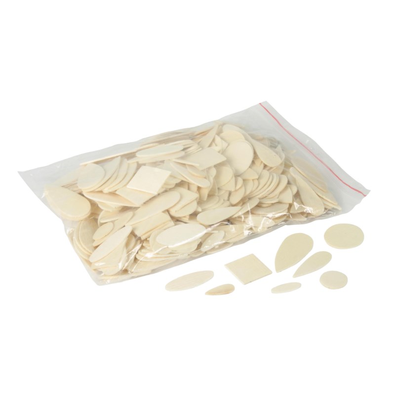 Houten schijfjes. Zak à 350 stuks in verschillende vormen.
