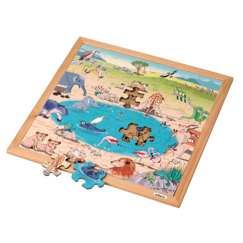 Leefgebieden - savanne is een legpuzzel die een levendig savannelandschap toont met dieren die drinken, jagen of rusten. De puzzel laat zien hoe roofdieren en prooidieren elkaar in balans houden. Kinderen zien hoe dieren zoals leeuwen, giraffen en nijlpaarden in dit droge gebied leven. De puzzel bevat stukken in verschillende groottes. De grootste zijn zo gevormd dat ze één dier isoleren om te benoemen.