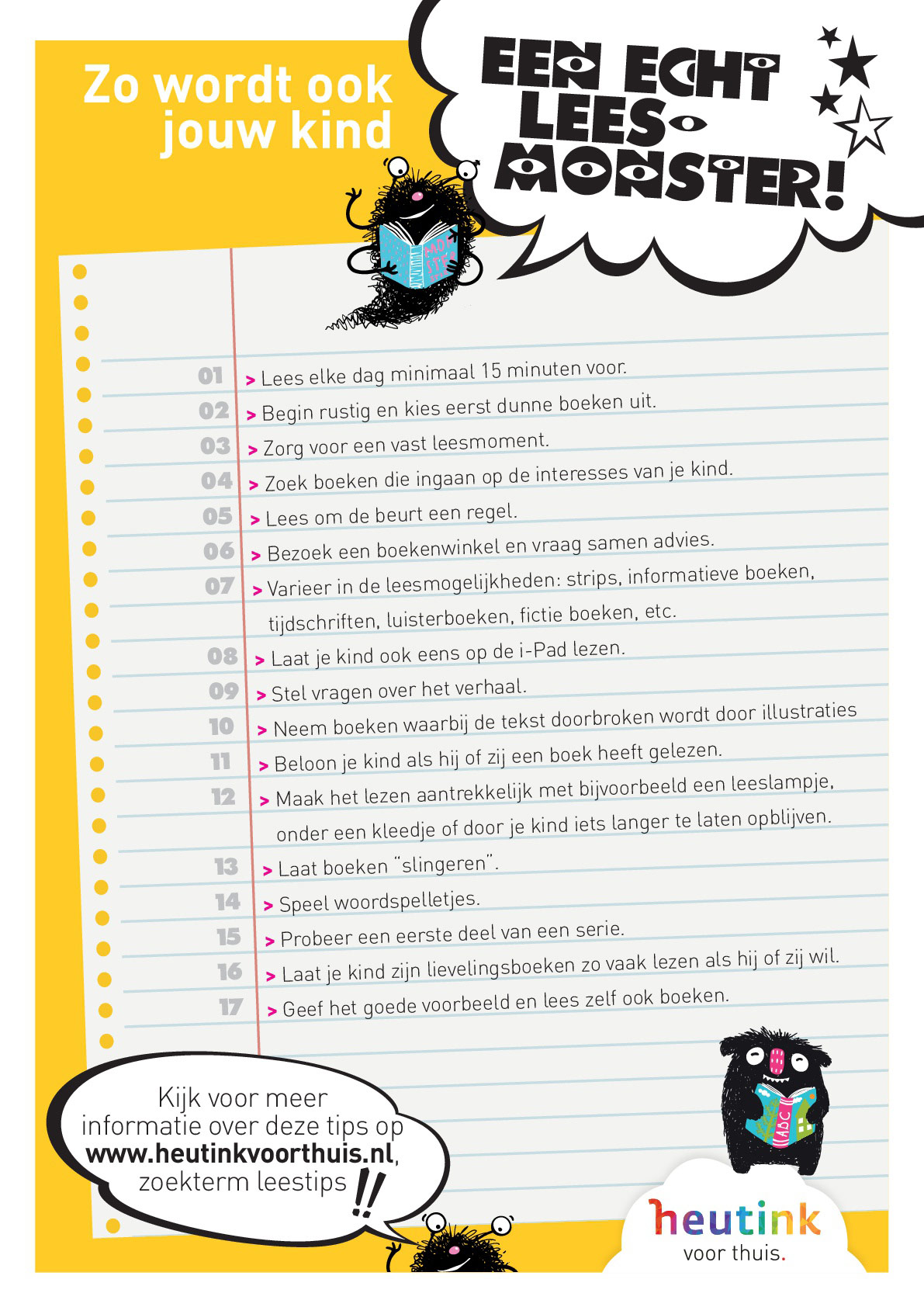 Juf Sanne en meester Sander hebben een handige tiplijst gemaakt om ervoor te zorgen dat het lezen meer in de smaak valt bij jouw kind. De tiplijst kun je ook downloaden en ophangen. We dagen je uit er zoveel mogelijk te proberen.