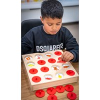 Zoek en vind - mijn wereld is een omgekeerd memospel. Til de schijven op, onthoud de beelden en zoek de juiste match. Dit stimuleert logisch denken en visuele waarneming. Kinderen trainen hun geheugen, bouwen woordenschat op en leren verbanden en patronen herkennen door goed te kijken en te onthouden.