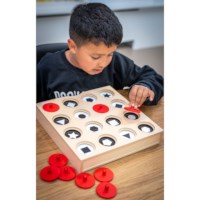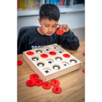 Til op, onthoud en verbind. Een omgekeerd memospel waarbij je onder afdekschijven zoekt naar de juiste match.