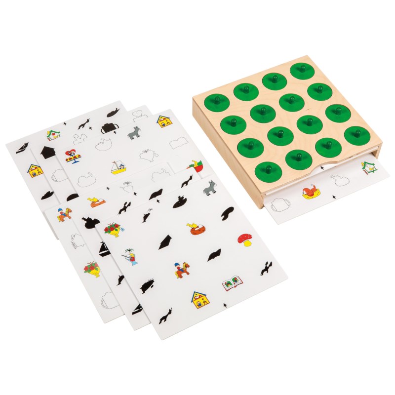Zoek en vind - schaduw en contour draait om visuele herkenning en geheugen. Kinderen plaatsen een opdrachtkaart in de cassette en tillen de afdekschijven op om de juiste combinaties te vinden. Door te observeren en te onthouden, versterken kinderen hun visueel onderscheidingsvermogen en ruimtelijk inzicht. Het spel stimuleert concentratie en logisch redeneren door verbanden te leggen tussen vormen en afbeeldingen.