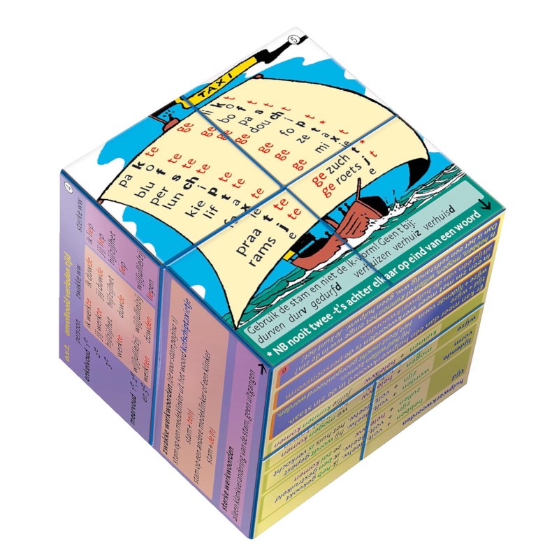 Inhoud: Een kubus met spellingschema, vervoeging, kofschipregel, hulp- en werkwoorden en deelwoorden. Vanaf 8 jaar. Formaat 6 × 6 cm (l x b).